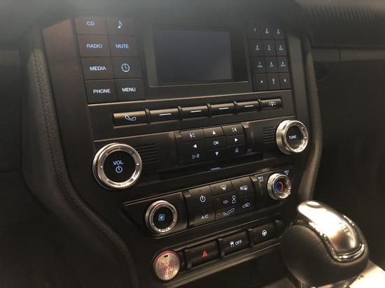 打开车门看到18款野马的内饰,如果不仔细看还发现不出明显的不同,总体变化不大。其中最大的不同就是中控台那么贯穿整个前舱的面板,之前是银色的铝制材料,现在变成了更加高级的黑色碳纤维材料制造。多功能方向盘还是原来的三幅式造型,旁边的中控物理按钮仔细看发现,新款野马把音响控制按钮放在左边,菜单控制按钮放在了右边,相比旧款对调了一下位置。