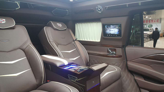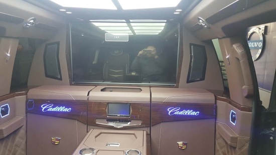 细节方面:凯迪拉克总统一号的前大灯和透明LED尾灯,大面积方格镀铬隔栅,都体现了凯迪拉克的家族设计。2017款凯迪拉克凯雷德总统一号内部为六座设计,前排为电动折叠座椅,座椅收起跟中间多功能实木吧台融为一体,形成更大吧台。后排为2个独立的电动按摩座椅带8向自动调节功能。乘客舱所有的电器全部集成在后排座椅中间小吧台的屏幕上,操作方便简单。全车都采用酒红色真皮包裹,档次和豪华程度无可比拟。