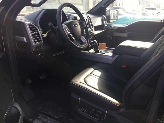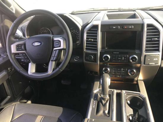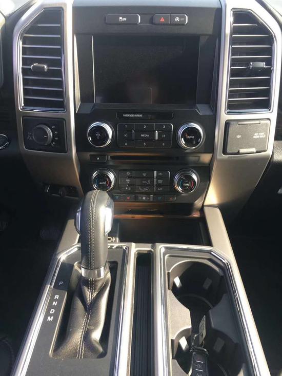 内饰方面:17款福特F150加版3.5T内饰以黑色为主,福特F150配合银色的镀铬装饰。座椅软硬程度适中,包裹性良好,车内的储物空间也非常丰富,中控台中间的显示屏带有倒车影像功能,增强了停车和挪车时的安全性。充满金属风格的银黑配色内饰和圆筒状出风口,也尽显F150的阳刚之气。