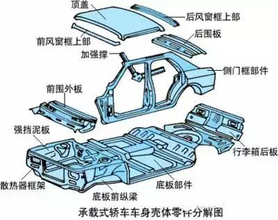 先来解释一下,所谓承载式车身就是汽车除了底盘以外,汽车车体本身也起着主要承载作用的车身。实际上承载结构的汽车框架不是一次成型的,而是由车头、车身和车尾(不同车型结构会有所不同)等不同单元组成,而他们之间的结合是通过焊接手段完成的。也就是说它们是一个互相依存的整体,谁也离不开谁,它们在车身的组合上是同一个级别。