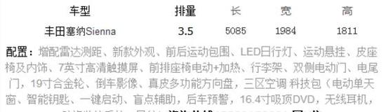 18款丰田塞纳是丰田MPV车型中功能最丰富,配置最豪华的车型之一。新款丰田塞纳以卓而不凡的品质、坚实可靠的性能,再次诠释了丰田家族的风采。18款丰田塞纳四驱版车身尺寸5085*1984*1811mm,221的功率,300匹马力,新的综合油耗将低至10.7升/百公里,这是一个相当惊人的数据!塞纳扭矩357,轴距为3030,超过了绝大多数SUV。