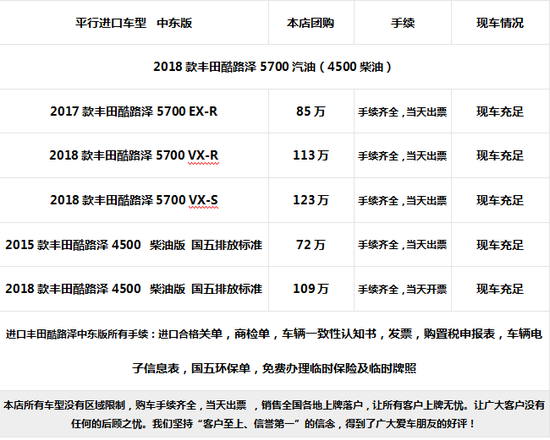 18款丰田酷路泽5700 VXS限量版参数动力:进口类型:丰田(平行进口) 长*宽*高:5170*1980*1930MM 车身结构:5门7座SUV 油箱容积:138 发动机型号:3UR-FE 排量:5663 进气形式:自然吸气 气缸排列形式:V8 每缸气门数:4 最大马力:397 最大功率:270 最大功率转速:5600 最大扭矩:529 最大扭矩转速:3200 变速箱:8挡手自一体变速箱驱动方式:前置四驱 四驱形式:全时四驱 车体结构:非承载式 轮胎规格:285/60 R18 备胎规格:全尺寸。
