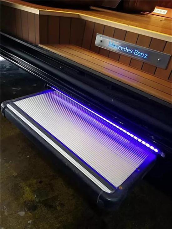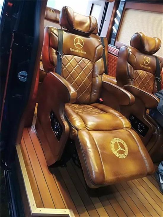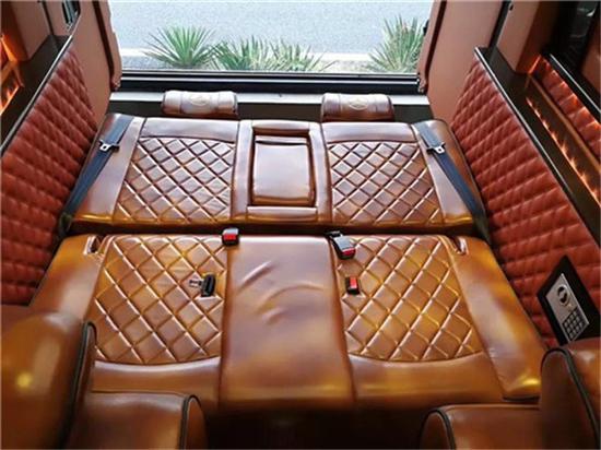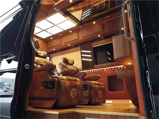 后排座是一张采用相同皮质的3人座沙发,坐感同样舒适,只需轻轻一按,在10秒钟的时间,它可以变成一张1M7*1M4的双人床,通过和前排座椅的对接,长度可以达到2M2,当然,相信后部座椅可以平放成床这样的设计很多商务车都采用,但奔驰的这张床,请仔细看,它并没有完全放平,这就是奔驰高科技和人性化的完美结合。