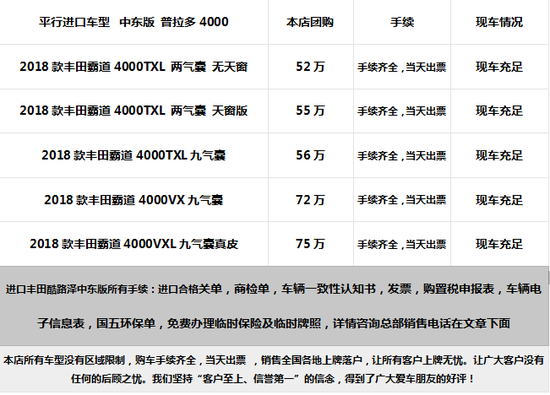 18款丰田霸道4000配置;后挂 2气囊 18轮熏黑轮毂 黑踏 拖车钩 字母彩条 电动折叠外后视镜 手动座椅 多功能方向盘 一键启动 DVD 冰箱 胎压报警,感谢您能看到我,本公司服务宗旨为诚信为本、顾客至上、 一次合作、 终身为友! 客户购车,可车接车送!车辆关单,商检齐全,随时看车,当日可提,免费办理临牌临时保险,全国可上牌,全国可办理分期。