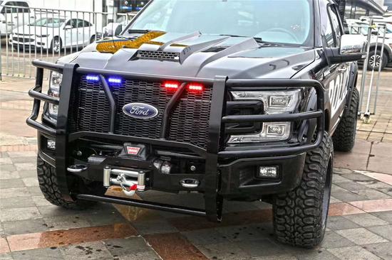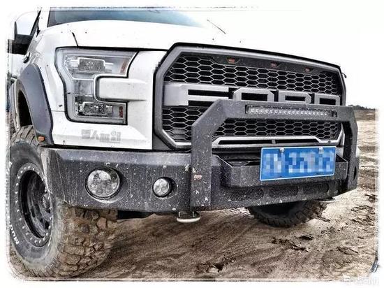 中网由原车镀铬风格替换成了FORD大字亚光黑的,颇具猛禽的感觉。中网上面的3个黄色行车灯真的很酷,对于一个大尺寸皮卡来说应该算得上点睛之笔了。