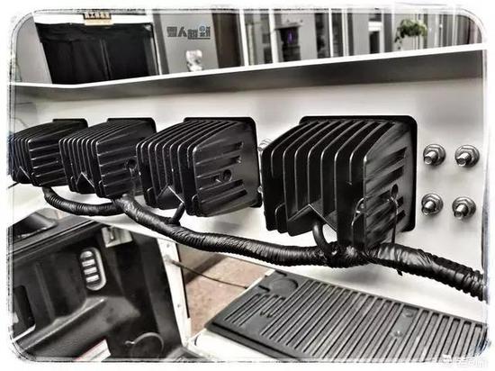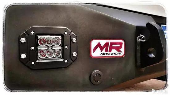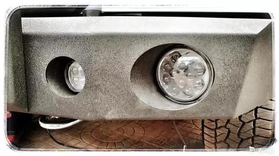 前杠上预留了3寸和5寸各两个射灯孔位,安装的LED射灯足矣照明车前100米范围的地面。广角设计算是对大灯的一个补充。而位于前杠中部的内嵌长条射灯,100W的亮度加上每个灯珠都配有一个透镜,照射距离可以达到300米之远。后面会介绍到的车顶4颗IPF射灯,弥补了更远距离的照射强度。如此搭配,夜间野外穿越还有什么可担心的吗?