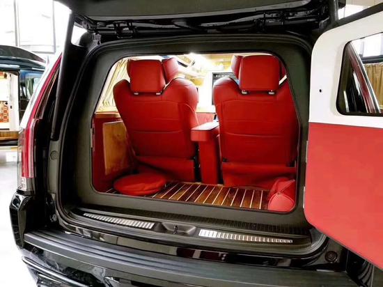 18款凯迪拉克总统一号隐藏六座商务车内饰部分:舱内隔断:可升降分隔屏,32寸超薄液晶电视 音响设备:BOSS环绕音响,DVD 舱内灯饰:氛围灯 LED灯饰,迈巴赫棚顶灯 舱内吧台:酒柜 咖啡机舱内桌板:电动隐藏式伸缩桌板 地板材质:柚木地板 舱内天窗:全景开启式大天窗。