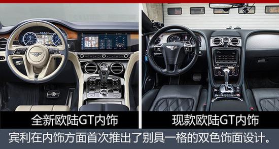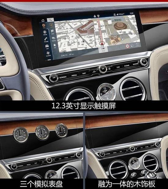 全新宾利欧陆GT内饰最大的亮点莫过于首次采用的“三面式旋转显示屏”(Bently Rotating Display),配有12.3英寸显示触摸屏,并且可通过旋转饰面的方式显示触摸屏、精美木饰面板以及设计典雅的三种模拟表盘。而12.3英寸显示触摸屏采用的是MMI多媒体系统,屏幕界面由宾利设计,可自定义设置主屏幕以及可以显示驾驶者偏好功能的三个窗口,例如显示导航、多媒体和接打电话等。