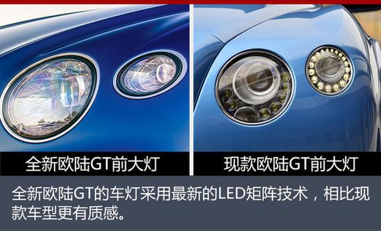 全新宾利欧陆GT采用了全新的设计风格,网状式的进气格栅明显加大,相比现款车型更具有很强的视觉冲击力。左右两侧经典的水滴造型前大灯则是采用了最新的LED矩阵技术,与现款相比更加晶莹剔透,车灯的表面采用了透明材质,使得大灯看上去棱角鲜明,十分有质感。