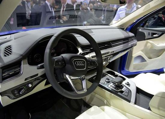 内饰方面:奥迪Q7的内饰延续了奥迪一贯的严谨细致,这应该是奥迪内饰的一个发展方向,在材质和做工上豪华精细。新奥迪Q7真皮包裹的四辐式方向盘造型饱满,角度以及深度可电动4向可调节,方向盘左侧的控制杆主要控制远近光以及转向灯,其它灯光控制通过驾驶员左侧的旋钮控制。