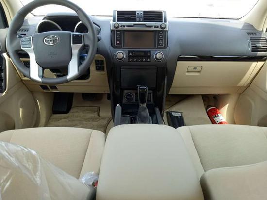 17款霸道4000天窗九气囊黑米 配置:9气囊,电动天窗,定速巡航,17铝轮,外挂备胎,冰箱,多功能方向盘,6速自动挡,车身稳定系统,主副驾驶位电动座椅,无匙进入,一键启动,胎压监测,车身同色可伸缩带转向灯外后视镜(电动折叠),前后雾灯,卤素大灯,7座,丝绒座椅,三区自动空调,黑踏。