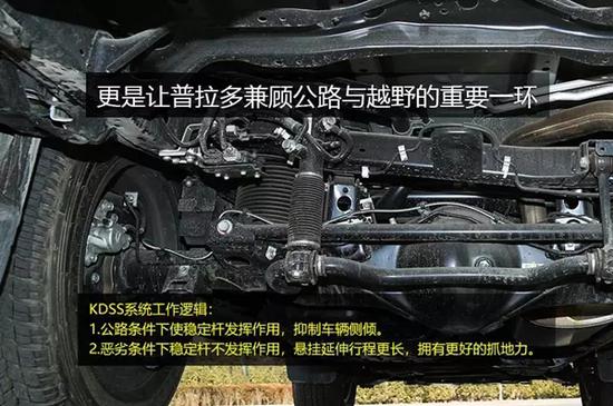 KDSS全称为Kinetic Dynamic Suspension System(活跃动态悬挂系统),是由一家澳大利亚Kinetic Pty Ltd的公司为丰田开发,适用于越野状态,监测到有车轮悬空时,单独调整悬挂液压筒,让某一车轮的悬挂更长,等于动态的提高了底盘高度,减少托底和失去动力的危险。这套系统只能选装在兰德酷路泽5700车型上,并不是所有丰田兰德酷路泽5700都有KDSS,而4600和4000很多是没有KDSS的。