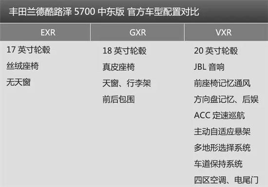 上面表格只列出最常见到的一些丰田兰德酷路泽4000,还有例如增加绞盘、增加外挂备胎、增加航空脚踏、增加大包围等叫法,都是在基础的EXR和GXR两个车型上增加或减去一些配置形成的。