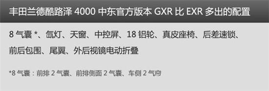 丰田兰德酷路泽4000在中东销售的丰田兰德酷路泽4000分为EXR和GXR两个车型,EXR为基本版,只有卤素大灯、2气囊、17英寸铁轮毂、无天窗、只有中央差速锁和基本的中控多媒体系统。
