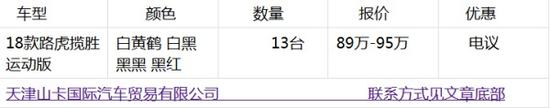 天津山卡国际贸易有限公司,成立于2002年6月,注册资金5000万元,是一家经国家工商总局批准的专业汽车销售单位。公司主要销售、奔驰、丰田,路虎,商务车,高档进口车为主。 代办各类新车的快速贷款,保险,上牌(包括外省市牌照),及汽车装潢等业务。18款路虎揽胜运动 (配置|询价)版3.0T,柴油版,汽油版,颜色齐全,多种配置可选,五一促销优惠,促销惊爆全国。