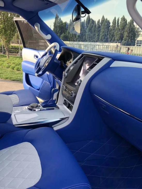 全部门板真皮包覆,和内饰一样搭配蓝白色,蓝天白云好心情。地板是皮质软包,和原车地毯一样吻合,但是耐用性非常高,还易打理。车顶个性化设计柔光灯,给完美的内饰更添加了一道亮丽的风景私人定制就是可以个性化,大胆新颖的想法都可以实现