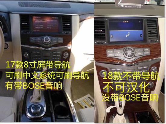 2018款日产途乐Y62内饰有米色和黑色可选,整体布局比较复古,皮质包裹与木纹并用的设计虽然略显老气,但在这辆硬派SUV上感觉还是很协调;整体操作以按键控制为主,虽然复杂的按键布局颜值不高,中控屏幕也不够大,但是按键的体验要比触摸更实用,同时可靠性更高;四辐式多功能方向盘不仅尺寸大,而且相当粗壮,可以控制音响、定速巡航、碰撞警示、多地形模式、车道偏离警示、以及并线提示等功能。