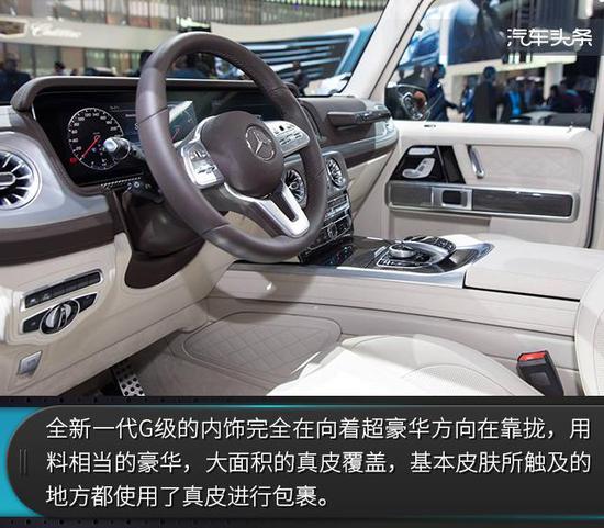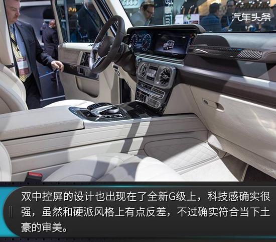 内饰方面全新的S级内饰终于现车在新款大G身上了这下让改动可以让很多人有购买的欲望全新一代G级最大的变化全部集中在内饰方面,家族化的设计语言随处可见,双12.3英寸屏幕非常震撼,让原本复杂的内饰简约了不少。不过“图腾”三把锁开关仍然是全新一代G级的核心,位置没有改变。此外,全新的三辐式多功能方向盘依然配备有奔驰双拇指控制(Dual Thumb Control)系统。