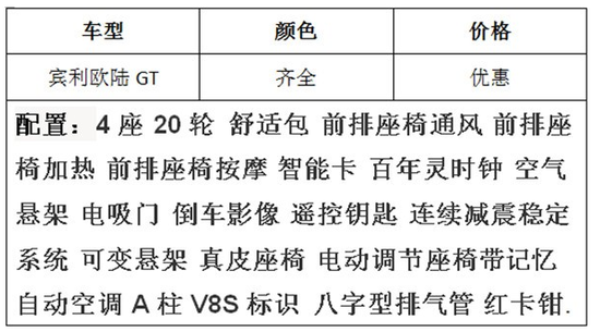 2018款宾利欧陆 (配置|询价)GT是全球最具设计风格的两门轿跑车,带给你无与伦比的动力感。前脸分体式LED前大灯是宾利车型最常见的设计,内部灯组采用最新的矩阵大灯技术,作为豪车,传承是不能少的。从握住欧陆方向盘的那一刻起,那与生俱来的动感风格就宣告着:您驾驭的,将是一部宾利倾注心血打造的双门轿跑车。彰显着气质与品味,众所周知,一个男的档次由以下几点体现,衣着;腰带;手表;汽车,其中汽车的占比非常之大,如果您选择了欧陆GT这款车那一定是一个很大的加分项。