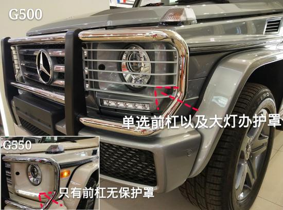 图三来看墨版G500单选了前杠以及大灯保护罩则美版G550为标配无保护罩。