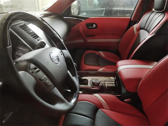 18款日产途乐Y62在内部整体采用了深色调的颜色搭配,带来具有高贵感的内饰氛围。同时,该车中控台及方向盘运用了大量的皮质包裹,在质感的营造上也较为出色。此外,这款车在换挡杆周围等区域融入了木纹装饰,这也相应提升了其内饰整体的豪华感。
