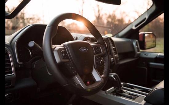 18款福特猛禽F-150皮卡3.5TT内饰采用独特的中控台和门饰板面漆和真皮包裹的方向盘。中控台部分辅以银色饰板装饰,六指针仪表盘的设计有些后工业时代的复古风格。