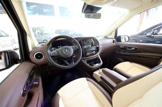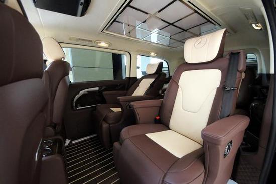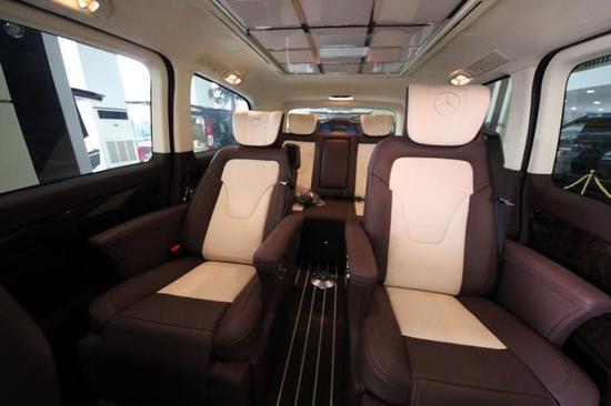 迈入奔驰威霆后部乘坐舱,车内整体以棕米两色相间色调为主,这样的色调体现出了一种油然而生的商务优雅质感。全车内饰以进口头层小牛皮完整包覆,游艇级柚木地板铺设于舱内,高端大气上档次。