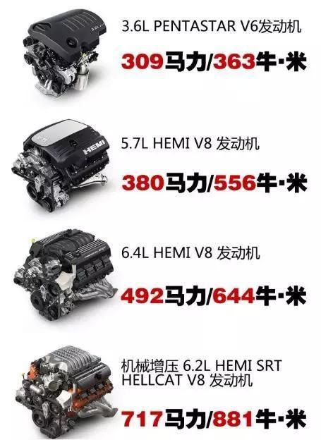 至于道奇挑战者的动力,它可是真对得起肌肉车这个称号,全系大排量发动机,最小排量也要3.6L,没有四缸发动机。这就是挑战者最有情怀的地方。3.6L Pentastar V6发动机,最大功率309马力/6350rpm,最大扭矩363牛▪米/4800rpm。V8入门版是5.7LHEMIV8发动机,与大切诺基SRT8同款最大马力380匹,最大扭矩556扭米。此外还有马力更大492马力的6.4L V8 HEMI,以及717马力的6.2L机械增压Hellcat。除了选配手动挡外,全系标配采埃孚8AT变速箱。