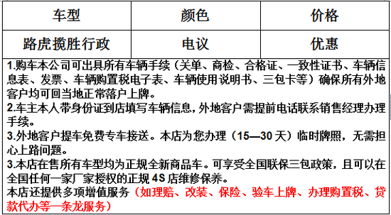 我公司郑重承诺 不收任何附加费用,一切费用前期说明之后,同意后即可付款提车 公司车辆:(全国联保 维修保养 售后质保 各地可上牌) 图片为实车拍摄。最新价格可致电 认准实体商家谨防上当受骗。 任何问题 欢迎您随时咨询我们 喜欢的朋友不妨关注微信朋友圈每天更新车型配置报价。