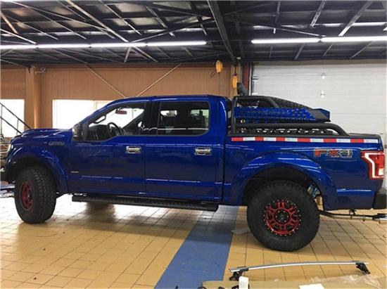 全新福特猛禽F150方方正正的前大灯与前保险杠造就了完美的车头造型与比例,进气格栅采用蜂窝状网格设计,并配以雕刻式的福特品牌标识。其前保险杠相当硬朗,且保险杠下方配备金属护板,以应对极端路况环境。整体的车架由高强度钢冲压而成,这样不但提高了车身的耐用性,更对乘客在安全方面有了进一步的保证。