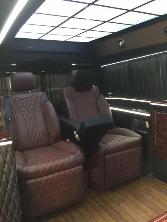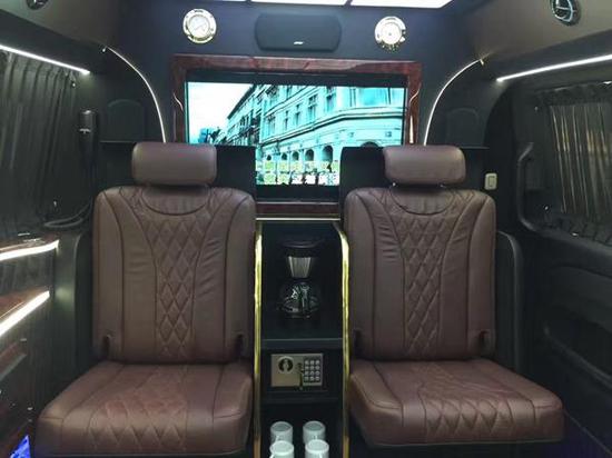 整个后舱的格局呢,倒是比较有进口Vclass的意味,后排的总裁VIP专座,这种风格明显的优势就在于老板平时自己用用会格外具有便利性和尊贵感,整个就是一个行走的总统套房;接待的话呢吧台可以一键电动切换成两个隐藏式秘书座椅,秘书在前排,老板们在后排看看电视、聊聊事情岂不快哉,同样配套的车载逆变电源插座,隐藏式桌板都在车壁上,随时候驾。