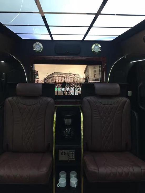 接下来又是一个老生常谈的问题,得聊配置了,豪华32寸液晶大屏、BOSE环绕式音响,吧台、电热水壶,蓝光玻璃酒柜啊,基本车上常用的也就这些,当然若是你想加什么配置,这类改装车都好说的;下边那个表现柜挺实用的,可以放些贵重的私人物品,然后电视侧边有个前后舱的联络电话,其实中间LED屏也带电动升降,家用、接待啊都不赖的。