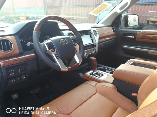 细节方面:2018款丰田坦途皮卡5米8的长度,这样的尺寸坦途不仅在公路上能独当一面的风光,在停车位上可能也得需要额外的照顾。内部装饰更接近SUV车型,木质的应用让这辆卡车拥有了几份细腻典雅的感觉。