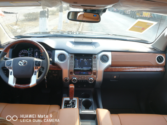 内饰方面:2018款丰田坦途皮卡的内饰做工十分精致,真皮座椅、桃木的方向盘、动感仪表盘,在简约的同时,透露着稳重与典雅的气息。仪表盘几乎颠覆了之前的全部设计,造型极为新颖。换挡杆造型没有变化,中央扶手箱的凹槽可以存放手机等杂物。