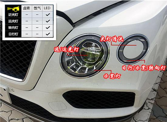2018款宾利添越四眼圆灯是宾利家族的标志性设计,自然不能缺少,为了保持车身的完整性,外侧圆环转向灯中间设计的是隐藏式的大灯清洗装置,光源方面全部采用LED大灯如宝石般璀璨。
