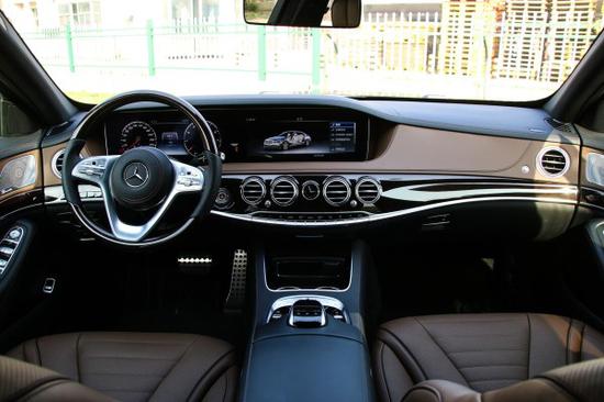 18款奔驰S560依旧是熟悉的造型,要说找出更大的不同,那就是全新造型的方向盘,由原来的两辐造型变为了三辐式,仪表盘和中控的屏幕变为一整块,18款的奔驰S560增加了畅心醒神功能,预设了活力、愉悦等6个情景,选择不同情景时车内的氛围灯、音乐音效、座椅按摩等都会根据所设情景改变,内部装饰延续了之前迈巴赫62的设计风格。