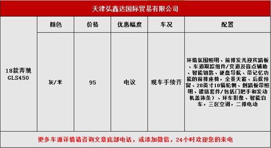 18款奔驰GLS450配置:环境氛围照明、前排发光迎宾踏板、车道跟踪组件/变道及盲点辅助、智能钥匙、硬盘导航、带记忆功能的前排座椅,全景天窗、后娱预留、20英寸10辐轮辋、侧踏板带照明、镀铬套件/包括门把手和发动机盖饰条)、环车影像、智能泊车,三区空调,二排电动