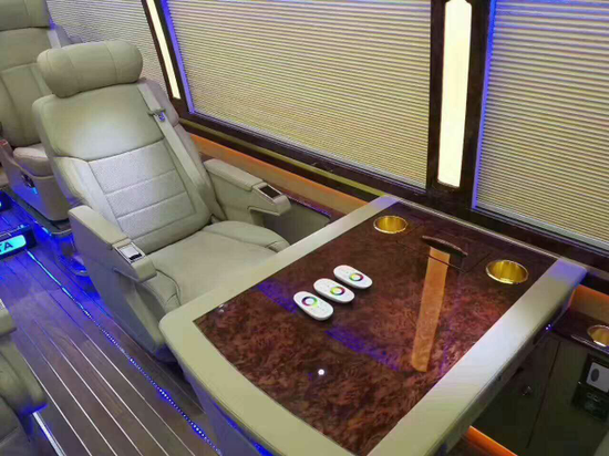 考斯特改装12座陆地头等舱由首席高端商务车改装设计师潜心设计的空间布局设计十分合理:当您走进车内,首先看到的是高级首长航空坐席,(无靠背、无扶手的)长软椅(装有厚垫靠背的)航空座椅前专门配备车载多功能汇报式办公桌。