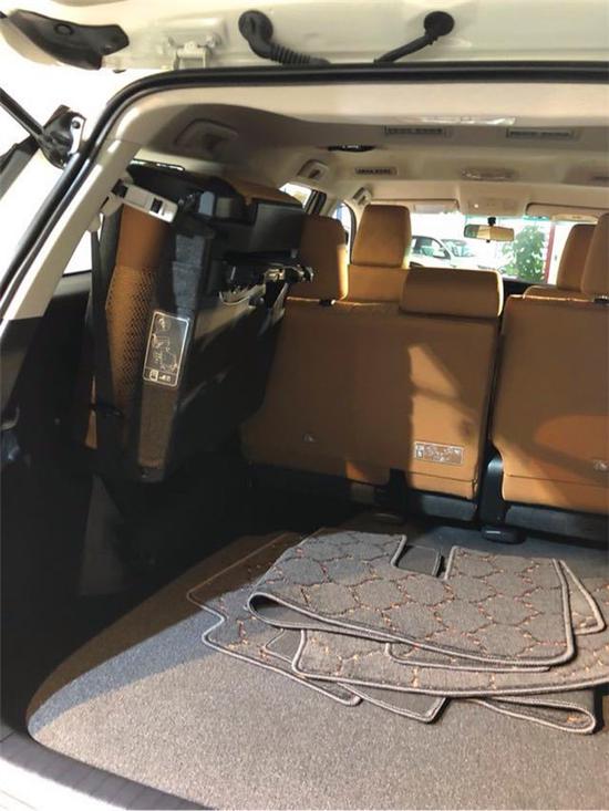 新车内饰改变的非常奢华,首先全车真皮座椅,色调较为柔和,没想到硬汉的外表下隐还藏着一个温柔体贴的心。配置方面,一体式的中控台简洁大方还配备了卫星导航系统,倒车影像、6个JBL扬声器、车辆遇险实时呼喊、自动碰撞提示灯安全性系统非常丰富。受益于车身尺寸的提升,车厢的内部空间也得到了提升,后备箱的标准容易有200L,二三排放倒后最大能营造出1080L的超大储物空间。