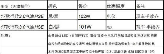 2018年天津降价幅度最大的车型车型价格颜色手续备注2017款路虎揽胜行政版3.0柴油电议齐全手续随车全国上牌联保2017款路虎揽胜行政版3.0汽油电议齐全手续随车全国上牌联保详情请致电文章结尾处电话咨询大客户经理,现在18款路虎17款的价 17款的跳楼价!