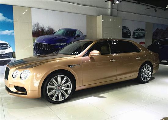 18款宾利Bentley Flying Spur V8S排量:3993cc 最大功率:373kw/507ps 0-100km加快:5.2s 长宽高:5299X2207X1488mm 。