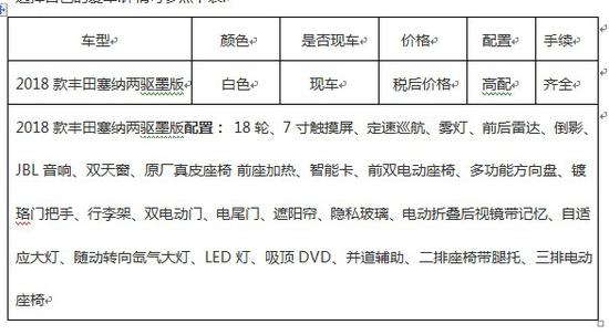 目前,天津运泽汽车贸易有限公司, 2018款丰田塞纳两驱墨版 现车充足,低价狂甩。现因国家降税新政策,车市销售淡季,故本月降价幅度已到近几年最低。所以,现在是消费者入手的好时机。天津运泽汽车贸易有限公司,自成立以来,本着诚信为本,客户至上的服务态度,薄利多销的服务理念,为客户及经销商提供汽车方面的服务,解答汽车相关的问题 ,我们没有附加条件,没有强制消费,只卖裸车, 从客户的切身利益出发,为的是保证每一个客户满意,放心的选择自己的爱车。详情可参照下表: