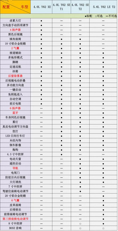 我们不止一次说过:4S店里的中规途乐4.0,其实是中东版,是东风日产委托平行进口商从中东引进的。中规4.0的三个型号:低配领英型,就是中东版XE;中配旗舰型,就是中东版SE-T2;而高配铂金型,就是中东版的PLT。三者之间的配置差异,可以看这个表: