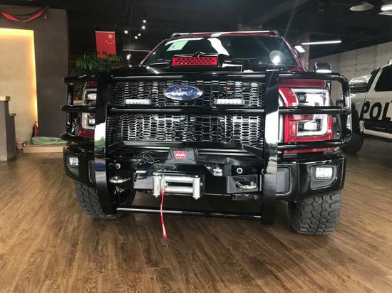 前中网经典猛禽原样带FORD字母标示,但是相比较更为霸气,前中网外观得护甲是跟前杠连为一体得,使之更加稳固,漂亮。改装前杠自带12500榜电动绞盘,为以后出门越野提供很大便利。前机盖改装黑色亮条,加进气格栅口,整体更为美观。