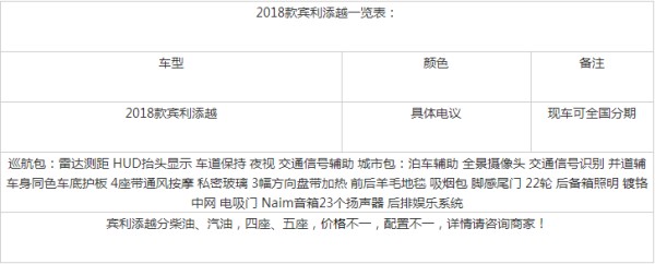 近日,在天津华夏安邦国际贸易有限公司了解到,2018款宾利添越 (配置|询价)大量现车在售,近期购车大优惠,购车赠送豪礼,隐形车衣,装饰,质保等,全国包上牌,配置多款,颜色齐全。手续齐全,[关单,商检,一次性证书,国五环保,当天开发票]