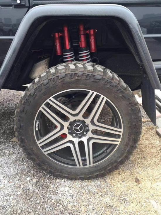 名称里的“4X4²”,表明这并非只是一款普通的四驱车型,而是将越野能力拓展之后的“增强版”。这辆另类的“大脚车”必定成为奔驰G级 (配置|询价)的新旗舰。要想翻山越岭,两双好鞋自然必不可少。即便是四轮版本,其巨大的越野轮胎同样引人注目。为进一步提升防侧翻能力,它的轮距进行了加宽。与此同时,轮眉也相应地向外延伸,并采用了黑色的碳纤维材料,突显整车的硬朗风格。