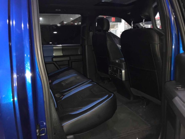 福特F150改装版采用带电冷热功能的可记忆式皮革座椅,头枕四向可调,搭配铝饰条和黑色钢琴烤漆内饰。可电动升降的后窗带隔板和电热除霜功能后排的座位三个过分宽敞,乘坐四个身材高大的乘客绝对没问题。从舒适性来说,软硬适中,包裹性也不错,并且主副驾驶位均配备了电动调节功能。