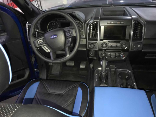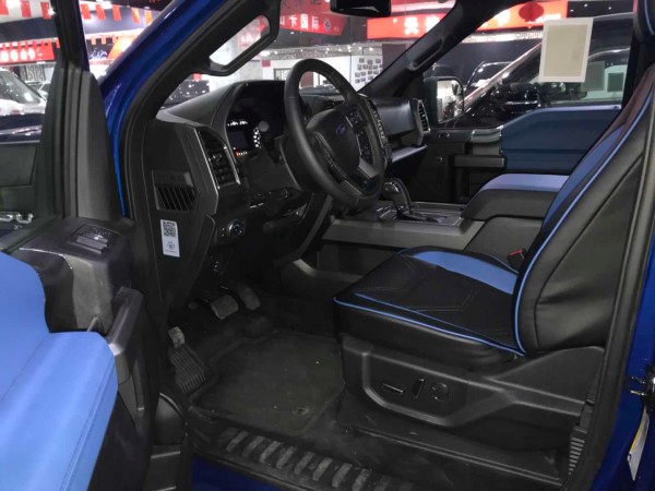 福特猛禽F150内饰采用独特的中控台和门饰板面漆和真皮包裹的方向盘。中控台部分辅以银色饰板装饰,六指针仪表盘的设计有些后工业时代的复古风格。采用带电冷热功能的可记忆式皮革座椅,头枕四向可调,搭配铝饰条和黑色钢琴烤漆内饰。可电动升降的后窗带隔板和电热除霜功能。