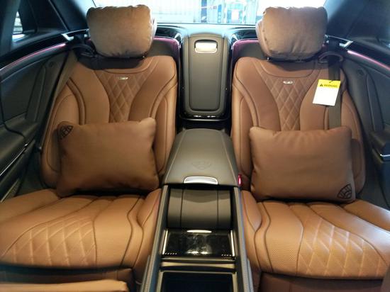 奔驰迈巴赫S650进入车厢内处处弥漫着豪华的氛围,中控台上有大面积的真皮包覆,同真皮座椅一样采用了菱形缝线的设计。哑光银饰和实木饰板的加入,使得整个中控区域更富有层次感。只是三幅式的多功能方向盘不如两幅式那么有岁月感,缩小了环身显然更偏向运动。仪表盘和中控屏同普通的S级一样采用了合二为一的双12英寸液晶设计,中控屏下方还布置了一块价格不菲的万国表,在空调操作区域下方也贴有迈巴赫的身份标识。