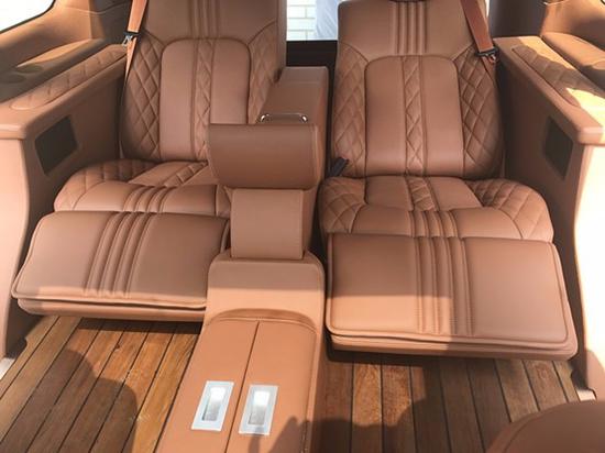 后排改装成两个座位,因为客户要求商务式座驾,所以改装的是类似阿尔法商务车的航空座椅带腿托,跑长途的时候特别的舒服,地板采用的是实木地板,中央扶手箱水杯架,烟灰缸,仓储箱,USB出口,真的是应有尽有了。